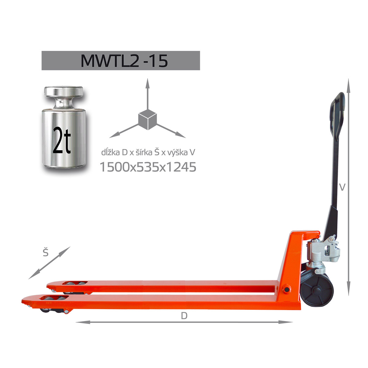 MWTL2-15 je paletový vozík s nosnosťou 2000 kg. Dĺžka predĺžených vidlíc je 1500 mm. Je vybavený silnou rozoberateľnou hydraulickou jednotkou. Je určený na manipuláciu s dlhými paletami, alebo bremenami. Tento paletový vozík je nutné zaťažovať celoplošne, nie bodovo - zabráni sa tým prípadné poškodenie konštrukcie. Ergonomická pogumovaná rukoväť zaručuje pohodlné ovládanie.