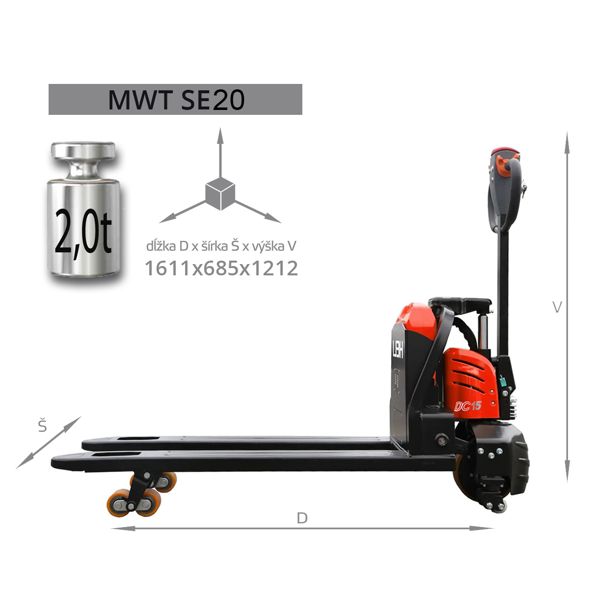 MWT SE20 je plnoelektrický paletový vozík s elektrickým pojazdom a zdvihom, nosnosťou 2000 kg. Súčasťou je lítiová bezúdržbová batéria s kapacitou 30 Ah / 24 V a malou externou nabíjačkou. Vozík je vybavený silnou, rozoberateľnou hydraulickou jednotkou. Pod vidlicami paletového vozíka vpredu sú osadené tandemové kladky pre lepšie rozloženie nosnosti. Na bokoch pri riadiacom kolese sú stabilizačné kolieska, ktoré zaručujú bezpečnú jazdu a manipuláciu s nákladom.