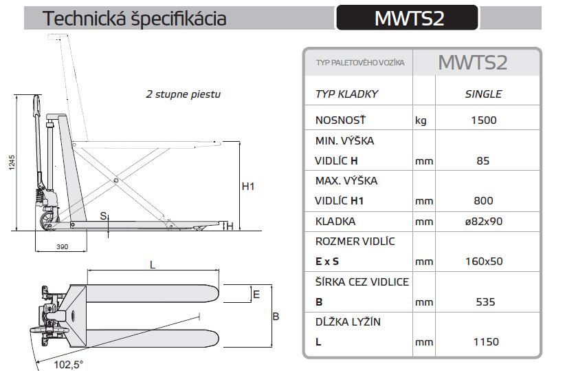 MWTS2 je paletový vozík nožnicový, ktorý je kombináciou paletového vozíka a pracovného stola s nosnosťou 1000 kg a maximálnym zdvihom 800 mm. Je vybavený dvojpiestnou teleskopickou hydraulickou jednotkou, ktorá zaistí ľahký zdvih materiálu do ergonomicky vyhovujúcej polohy. Bezpečnostné nožnicové podpery zaručia výbornú stabilitu vozíka pri nakladaní. Ergonomická pogumovaná rukoväť zaručuje pohodlné ovládanie.