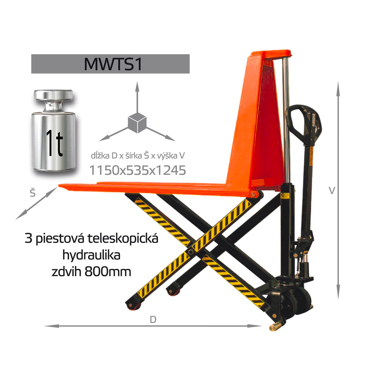 MWTS1 je paletový vozík nožnicový, ktorý je kombináciou paletového vozíka a pracovného stola s nosnosťou 1000 kg a maximálnym zdvihom 800 mm. Je vybavený trojpiestnou teleskopickou hydraulickou jednotkou, ktorá zaistí ľahký zdvih materiálu do ergonomicky vyhovujúcej polohy. Bezpečnostné nožnicové podpery zaručia výbornú stabilitu vozíka pri nakladaní. Ergonomická pogumovaná rukoväť zaručuje pohodlné ovládanie.