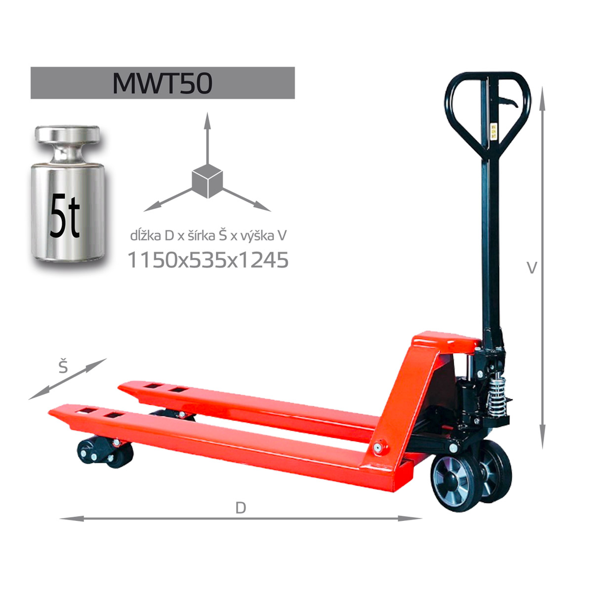 MWT50 je ťažkotonážny paletový vozík s nosnosťou 5000kg. Má zosilnenú konštrukciu a je vyrobený z plechu o hrúbke 5 mm. Je vybavený rozoberateľnou masívnejšou hydraulickou jednotkou a špeciálne vystuženými vidlicami. Tieto parametre zaručujú bezpečne zdvíhať a manipulovať s bremenami do hmotnosti 5000 kg. Tento paletový vozík je nutné zaťažovať celoplošne, nie bodovo - zabráni sa tým prípadné poškodenie konštrukcie. Ergonomická pogumovaná rukoväť zaručuje pohodlné ovládanie.