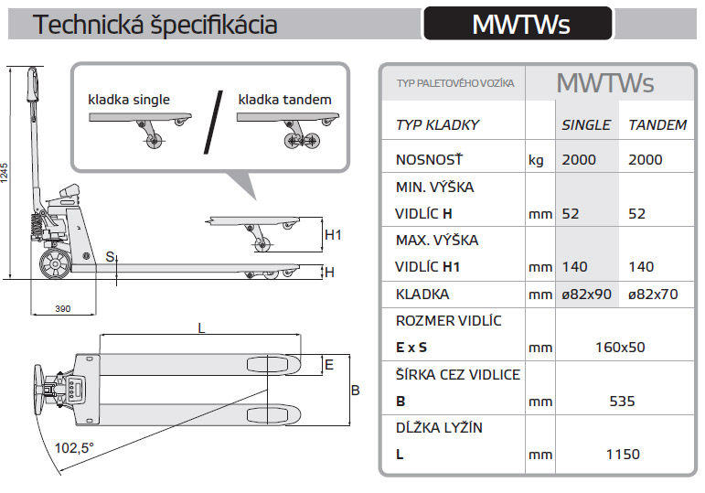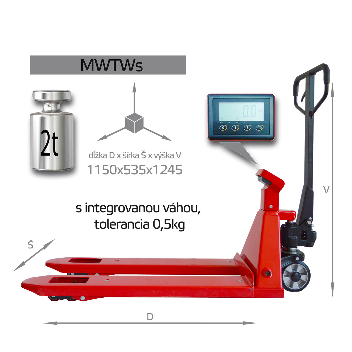 MWTWs je paletový vozík s digitálnou váhou s LED displejom s nosnosťou 2000 kg. Je vhodný na rýchle a presné váženie bremena. Vďaka multifunkčnému displeju je možné zvážený materiál nechať na vozíku, vynulovať hodnotu váženia a nasledujúci materiál zvážiť, ako "čistú" váhu. Tento úkon je možné vykonávať dovtedy, kým celková hmotnosť palety nedosiahne 2000 kg. Presnosť váženia je 0,5 kg. Ergonomická pogumovaná rukoväť zaručuje pohodlné ovládanie.