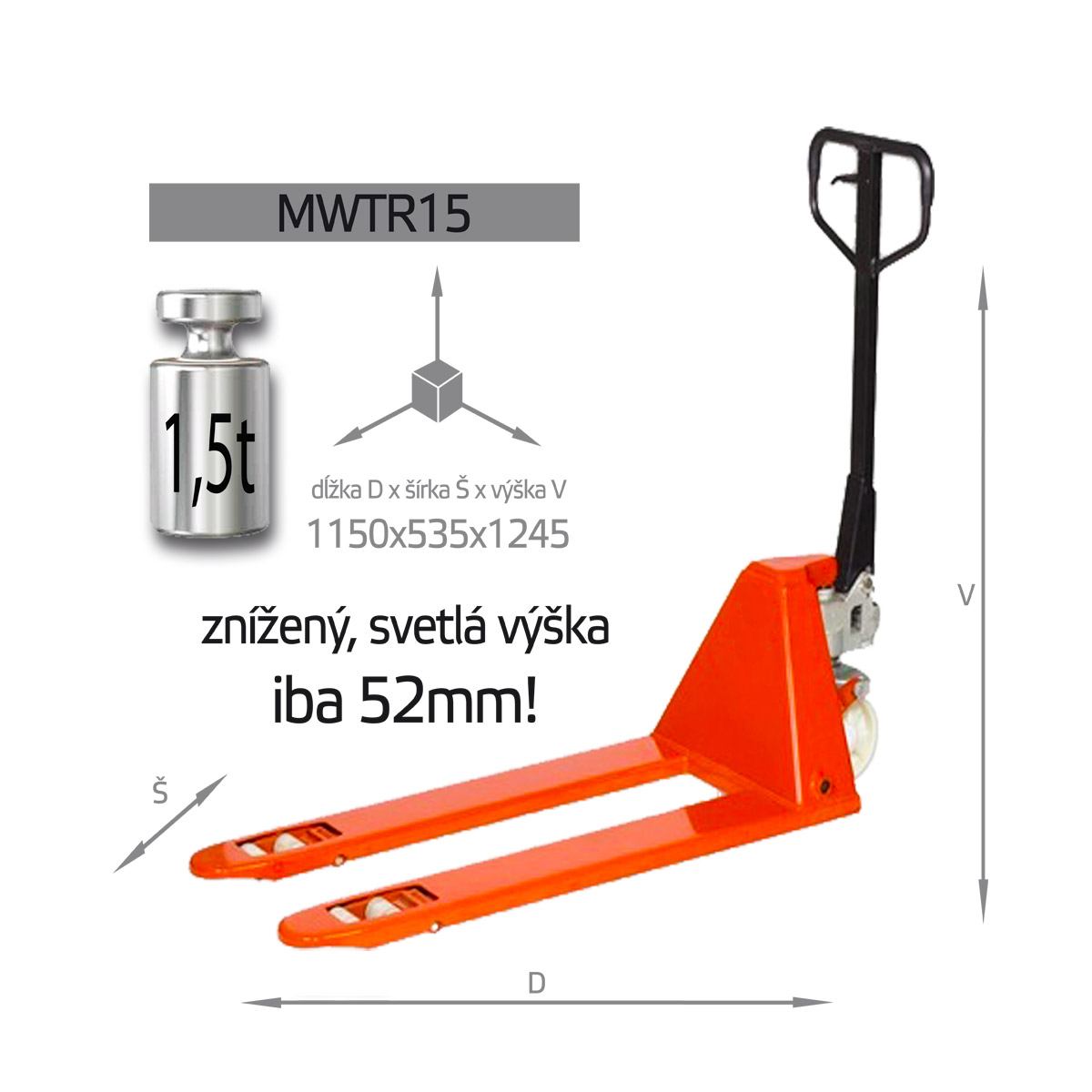 MWTR15 je paletový vozík s nosnosťou 1500 kg a so zníženým profilom (svetlá výška) 52 mm. Je vhodný na manipuláciu s paletami, ktoré nedosahujú svetlú výšku štandardných paliet, teda sa nedajú použiť štandardné paletové vozíky.